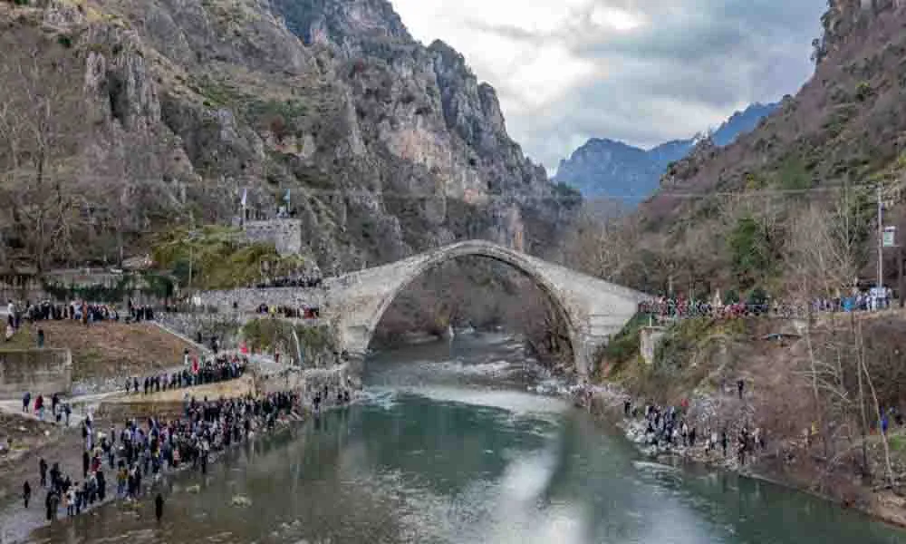 Εορτασμός των Θεοφανίων στην Κόνιτσα δίπλα στην πέτρινη μονότοξη γέφυρα