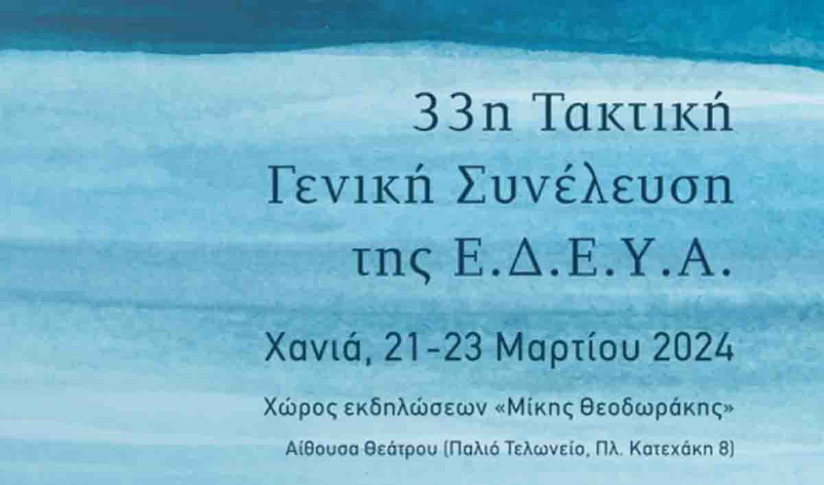 Την Παρασκευή 22 Μαρτίου θα διεξαχθεί η 33η Τακτική Γενική Συνέλευση της ΕΔΕΥΑ για τη εκλογή της νέας Διοίκησης.