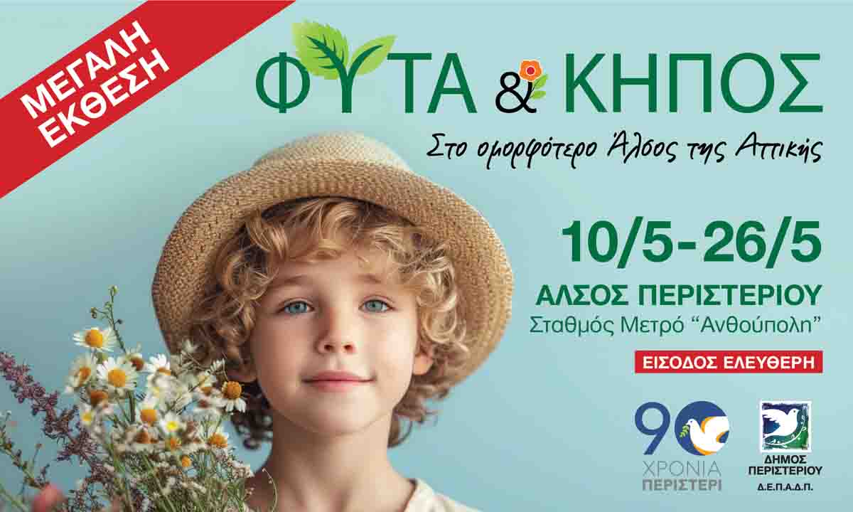 Μεγάλη έκθεση “ΦΥΤΑ & ΚΗΠΟΣ” στο ομορφότερο Άλσος της Αττικής, στο Άλσος Περιστερίου (στάση Μετρό “Ανθούπολη”), από τις 10 έως τις 26 Μαΐου 2024, με ωράριο 11:00 – 22:00. Είσοδος ελεύθερη παντού!