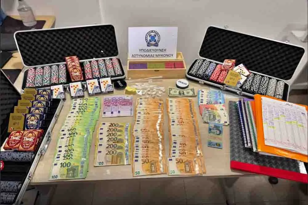 Από την Υποδιεύθυνση Αστυνομίας Μυκόνου εντοπίστηκε, σε περιοχή της Μυκόνου, παράνομη χαρτοπαιχτική λέσχη όπου διεξάγονταν «τζόγος» και συνελήφθησαν όλοι οι συμμετέχοντες μαζί με τους διοργανωτές. Κατασχέθηκαν 19.485€, 15 «φιξάκια» κοκαΐνης, παιγνιόχαρτα, μάρκες και χειρόγραφες σημειώσεις. Συνελήφθησαν επ’ αυτοφώρω 21 άτομα που συμμετείχαν σε  διενέργεια «poker».