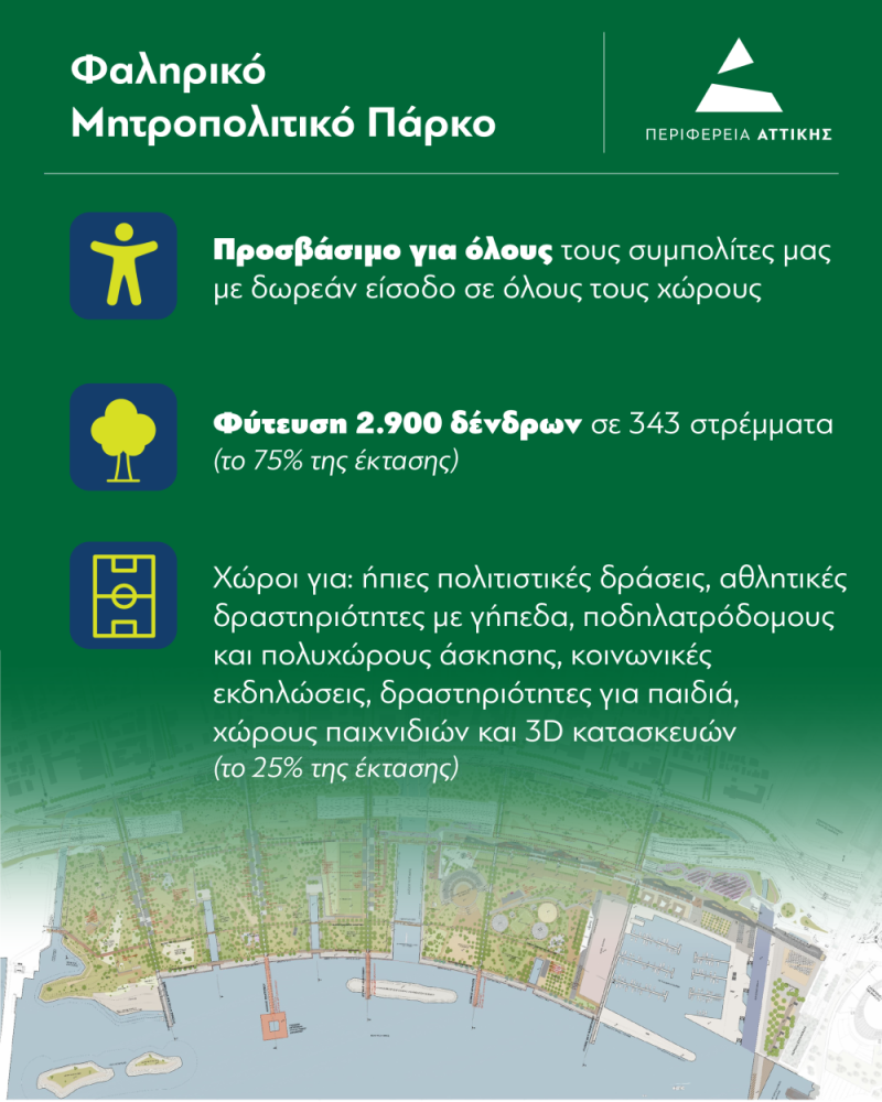 Κυρίαρχα στοιχεία της φυσιογνωμίας του έργου, είναι η συμπερίληψη και η προσβασιμότητα χωρίς αποκλεισμούς και εξαιρέσεις, καθώς το πάρκο θα είναι φιλικό σε πεζούς και ποδηλάτες, σε ΑμεΑ και ανθρώπους με κινητικά προβλήματα – ένας πνεύμονας πρασίνου με 2.900 δέντρα που θα φυτευτούν δίπλα στη θάλασσα, σε απόσταση αναπνοής από το κέντρο της Αθήνας, ιδανικός για ποικίλες δραστηριότητες για κάθε ηλικία.