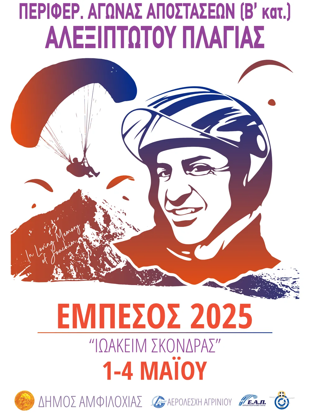 Έξι χρόνια μετά τον τελευταίο αγώνα στον Εμπεσό, όπου καταγράφηκε και το πανελλήνιο ρεκόρ απόστασης σε επίσημο αγώνα πρωταθλήματος, η Ελληνική Αεραθλητική Ομοσπονδία και το σωματείο «Αερολέσχη Αγρινίου» με την υποστήριξη του Δήμου Αμφιλοχίας διοργανώνουν ξανά στις 1-4 Μαϊου 2025 τον Περιφερειακό Αγώνα Αποστάσεων (Β’Κατηγορίας) Αλεξίπτωτου Πλαγιάς «Ιωακείμ Σκόνδρας», υπό την Αιγίδα της Ελληνικής Αεραθλητικής Ομοσπονδίας.