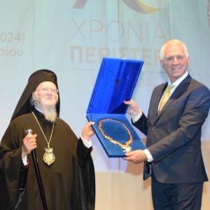Ο Δήμαρχος Περιστερίου Ανδρέας Π. Παχατουρίδης τίμησε τον Οικουμενικό Πατριάρχη κ.κ. Βαρθολομαίο, με το Μετάλλιο της Αξίας, της Πόλης, στις 23 Νοεμβρίου 2024, στο κατάμεστο Θέατρο Πολιτών.