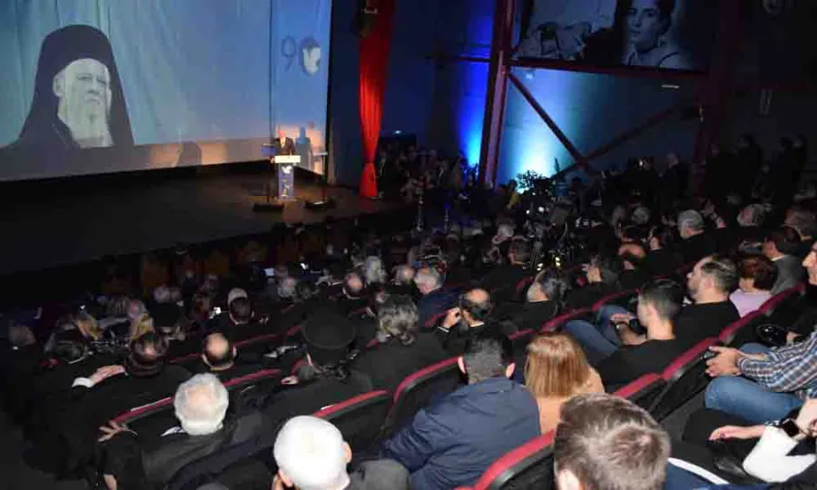 Στο κατάμεστο Θέατρο Πολιτών και στους εξωτερικούς χώρους από πλήθος πολίτων, υποδέχθηκαν τον Πατριάρχη, τιμητικές αντιπροσωπίες μαθητών των γυμνασίων, εθνικοτοπικών συλλόγων και φορέων της πόλης.