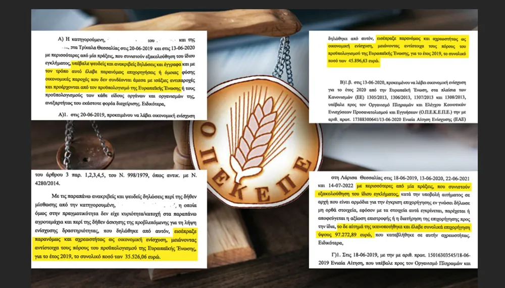 Η κόρη του Ν.Χ. φέρεται ότι στις 20.06.2019 και στις 13.06.2020,υπέβαλε ψευδείς και ανακριβείς δηλώσεις και έγγραφα προκειμένου να λάβει οικονομική ενίσχυση για το έτος 2019 και το 2020 από την Ευρωπαϊκή Ενωση. Υπέβαλε λοιπόν προς τον ΟΠΕΚΕΠΕ την αίτησή της, στην οποία συμπεριέλαβε «ανακριβείς και ψευδείς δηλώσεις και έγγραφα αναφορικά με τους αγρούς που φέρονταν ότι μίσθωνε και ότι δήθεν ασκούσε τις προβλεπόμενες δραστηριότητες για την λήψη της ενίσχυσης».