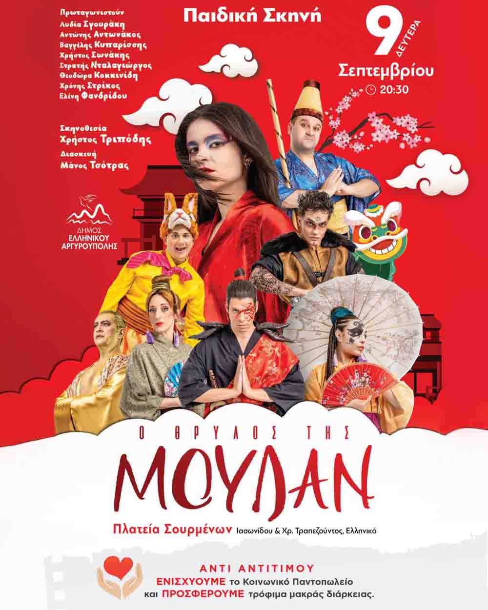 Ο Πολιτιστικός Σεπτέμβρης του Δήμου Ελληνικού – Αργυρούπολης συνεχίζεται τη Δευτέρα 9 Σεπτεμβρίου στις 20:30, στην Πλατεία Σουρμένων (Λ. Ιασωνίου, Χρ. Τραπεζούντος, Ελληνικό) με μια εντυπωσιακή θεατρική παραγωγή, βασισμένη στο αρχαίο κινέζικο ποίημα «Η Μπαλάντα της Χουά Μουλάν», με εντυπωσιακά κοστούμια, σκηνικά, σπαθομαχίες και χορογραφίες, καθώς και διαδραστικό παιχνίδι με το κοινό.