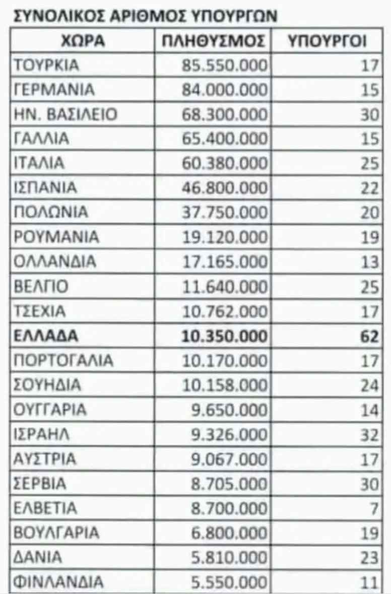 ΥΓ2: Σύγκριση των μελών κυβερνήσεων Ελλάδας και Καναδά! Ο Κάρνεϊ διαδέχθηκε τον Τζάστιν Τριντό στην πρωθυπουργία του Καναδά και όπως είναι φυσικό διόρισε και την νέα του κυβέρνηση. Και εδώ αρχίζουν τα… σοβαρά. Η νέα κυβέρνηση των φιλελευθέρων έχει 24 υπουργούς -13 άνδρες και 11 γυναίκες, συμπεριλαμβανομένου του ίδιου του πρωθυπουργού- και κανέναν αντιπρόεδρο της κυβέρνησης. Επίσης, διατηρεί τη βασική ομάδα του Τριντό που ασχολείται με τον εμπορικό πόλεμο με τον πρόεδρο των ΗΠΑ Ντόναλντ Τραμπ, αλλά εκπαραθύρωσε 18 μέλη του υπουργικού συμβουλίου του πρώην πρωθυπουργού. Στην Ελλάδα πάλι ο Κυριάκος Μητσοτάκης έφτιαξε μια νέα κυβέρνηση με 63 μέλη – εκ των οποίων μόλις 15 γυναίκες-. Σημειώστε ότι ο Καναδάς έχει 40 και κάτι εκατομμύρια κατοίκους και η απειλεί του Τραμπ είναι πραγματική… Αυτά για να μην ξεχάσουμε και όσα ξέρουμε με τα περί ευέλικτου και λειτουργικού υπουργικού συμβουλίου…