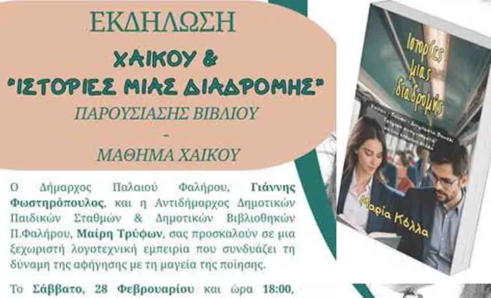 Το Σάββατο, 28 Φεβρουαρίου και ώρα 18:00, στην Κεντρική Δημοτική Βιβλιοθήκη (Αγίου Αλεξάνδρου 5), θα παρουσιαστεί το βιβλίο «Ιστορίες μιας διαδρομής» της βραβευμένης συγγραφέως – ποιήτριας Μαρίας Κολλά, ενώ θα ακολουθήσει βιωματικό μάθημα χαϊκού για κάθε ηλικία.