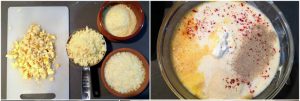 - Ετοιμάζετε την γέμιση: Σε μπολ βάζετε το γάλα και όλα τα πρώτα υλικά. Ανακατεύετε. Αν δοκιμάσετε την μικρή πίτα στο στρογγυλό μπολ, κρατήστε 1 1/4 φλ. από την γέμιση χωριστά.