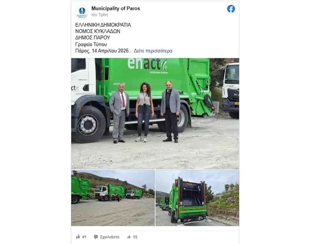 Ο Δήμος Πάρου ανακοινώνει ότι υπογράφηκε σήμερα, (14 Απριλίου 2026), η σύμβαση για την «Παροχή υπηρεσιών για την αποκομιδή απορριμμάτων οικισμών Δήμου Πάρου».