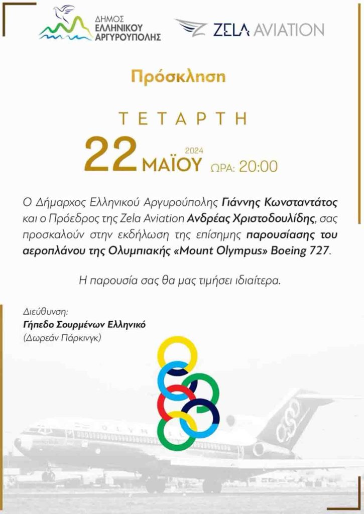 Ο Δήμαρχος Ελληνικού Αργυρούπολης Γιάννης Κωνσταντάτος και ο Πρόεδρος της Zela Aviation Ανδρέας Χριστοδουλίδης, σας προσκαλούν την Τετάρτη 22 Μαΐου 2024, στις 20:00 στο Γήπεδο Σουρμένων (Ελληνικό), στην εκδήλωση της επίσημης παρουσίασης του αεροπλάνου της Ολυμπιακής «Mount Olympus» Boeing 727.