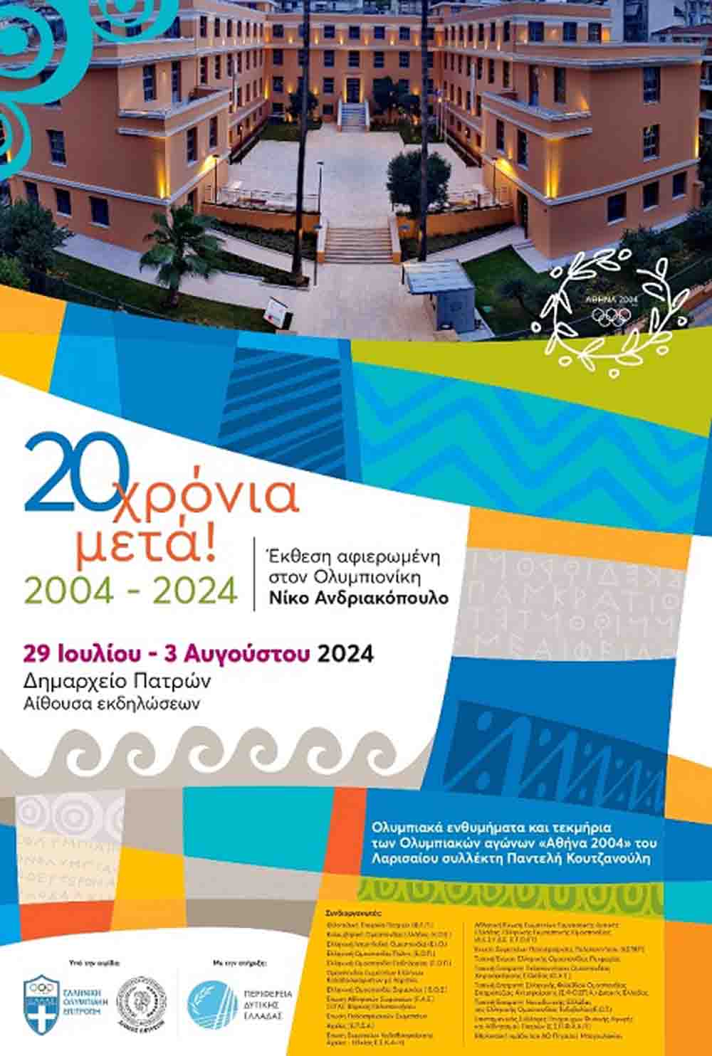 Υπό την αιγίδα της Ελληνικής Ολυμπιακής Επιτροπής και του Δήμου Πατρέων, ανοίγει τις πύλες της την ερχόμενη Δευτέρα 29 Ιουλίου, στις 11 το πρωί, η μεγάλη έκθεση Ολυμπιακών Ενθυμημάτων «Ολυμπιονίκης Νίκος Ανδριακόπουλος», στο νέο Δημαρχείο της πόλης, εγκαινιάζοντας με τον καλύτερο τρόπο, την μεγάλη αίθουσα εκδηλώσεων.