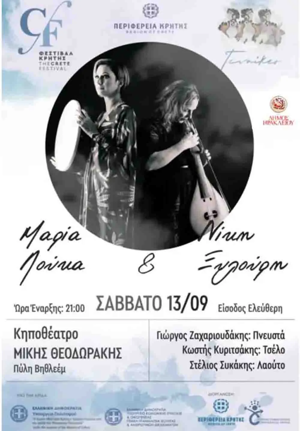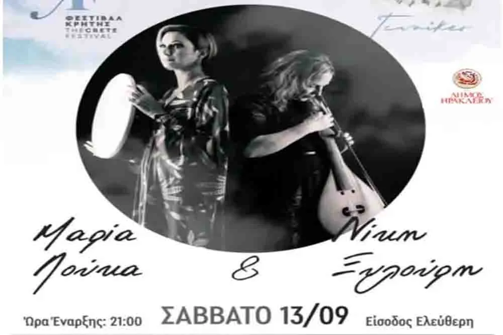 Στο πλαίσιο της παράλληλης δράσης του 5ου Φεστιβάλ Κρήτης «Γυναίκες», που υλοποιείται για 2η συνεχόμενη χρονιά, με την υποστήριξη του Αυτοτελούς Γραφείου Ισότητας της Περιφέρειας Κρήτης, παρουσιάζεται η συναυλία παραδοσιακής μουσικής με έντεχνο λόγο και ποίηση, με τις Μαρία Λούκα και Νίκη Ξυλούρη, στο Κηποθέατρο «Μίκης Θεοδωράκης», στην Πύλη Βηθλεέμ, το Σάββατο, 13 Σεπτεμβρίου, στις 9:00μ.μ., με ελεύθερη είσοδο.