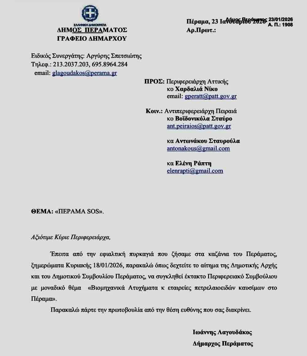 Την διεξαγωγή περιφερειακού συμβουλίου στο Πέραμα με αποκλειστικό θέμα τη συζήτηση για την μετεγκατάσταση εκτός κατοικημένης περιοχής των δεξαμενών καυσίμων των εταιρειών πετρελαιοειδών ζητούν με επίσημη επιστολή προς τον Νίκο Χαρδαλιά ο Δήμος και η δημοτική αρχή Περάματος μετά την πυρκαγιά στα «Καζάνια», η οποία έθεσε σε κίνδυνο την ασφάλεια των κατοίκων, της πόλης και μεγάλου μέρους της Αττικής. Η επιστολή με «θέμα Πέραμα SOS» εστάλη στις 23 Ιανουαρίου, ημέρα της κινητοποίησης των πολιτών και του Δήμου Περάματος που πραγματοποιήθηκε με μαζική συμμετοχή μετά τη φωτιά, με αίτημα να φύγουν τα «Καζάνια» και να δημιουργηθεί έξοδος διαφυγής από τη πόλη για την αντιμετώπιση έκτακτης ανάγκης ή νέου ατυχήματος.