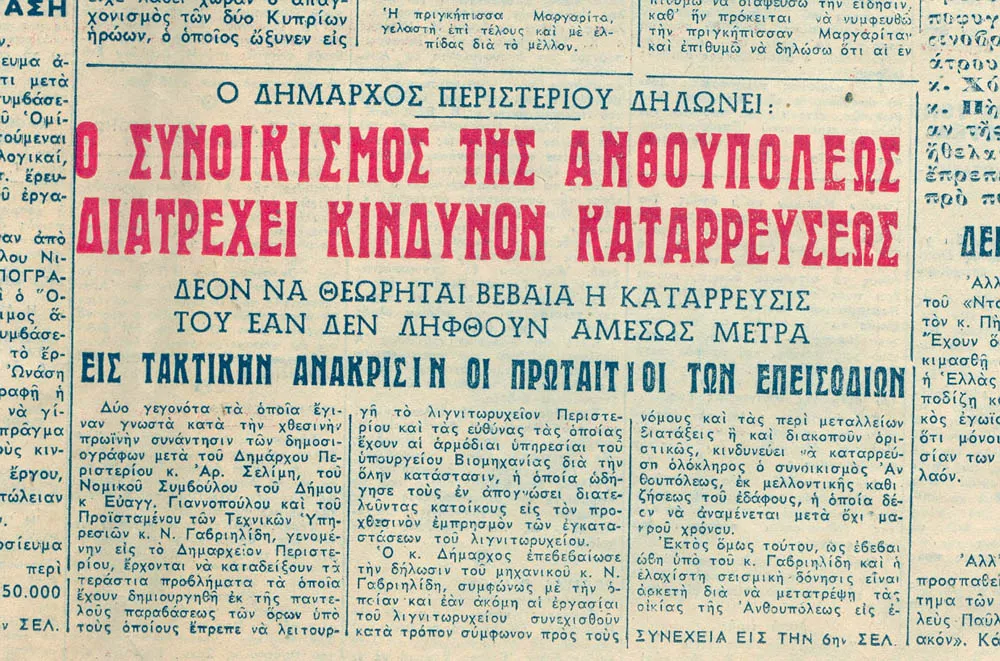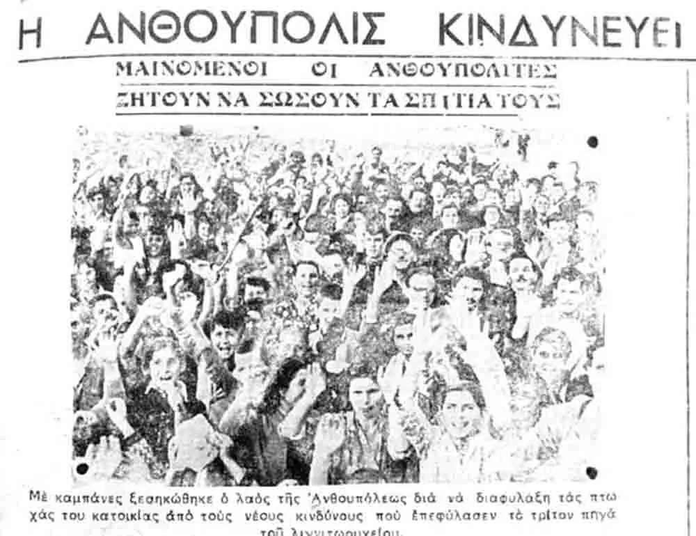 Με ένα ξέσπασμά τους χιλιάδες κάτοικοι της Ανθούπολης Περιστερίου και με ολονύχτια μάχη με τη χωροφυλακή έδωσαν τέλος στον εφιάλτη της παράνομης και έξω από κάθε κανόνα ασφαλείας λειτουργίας του λιγνιτωρυχείου της περιοχής, που με τις συνεχείς εκρήξεις δυναμίτιδας σε μικρό βάθος, κατέστρεψε πολλά σπίτια στην περιοχή.
