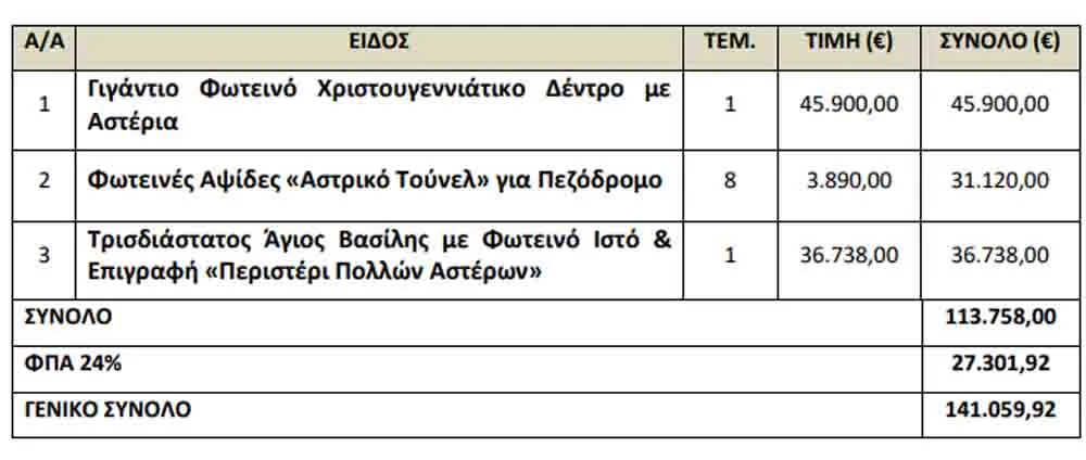 Σε ότι αφορά, την δαπάνη των 141.059,92 ευρώ για την προμήθεια διακοσμητικού εορταστικού εξοπλισμού, ο δήμος Περιστερίου, με διαγωνισμό που βαίνει στην ολοκλήρωσή του, διαγωνισμό που η διακήρυξή του φέρει την του δημάρχου της Πόλης κ. Α.Παχατουρίδη, προβλέπετε με αυτή η απόκτηση των εξής: