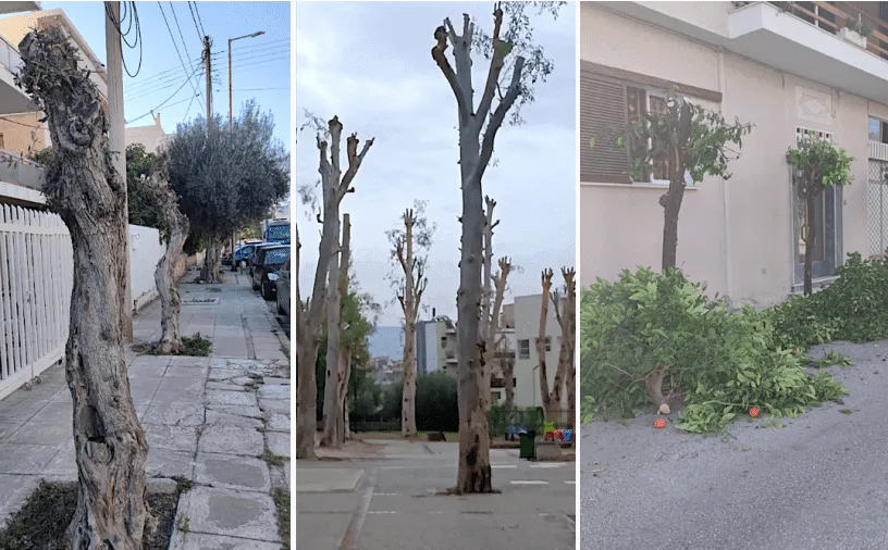 - Μετά την τομή, τα δέντρα προσπαθούν να επιβιώσουν παράγοντας πλήθος νέων βλαστών, οι οποίοι όμως δεν εκφύονται φυσιολογικά, αλλά από «μάτια» του κορμού. Αυτοί οι επικόρμιοι κλάδοι έχουν ασθενέστερη πρόσφυση, με αποτέλεσμα αυξημένο κίνδυνο πτώσης ή θραύσης, που απειλεί τους πολίτες και εκθέτει τον Δήμο σε νομικές ευθύνες. Αυτή η «γρήγορα να τελειώνουμε» πρακτική μας κάνει να αναρωτιόμαστε αν εφαρμόζεται από τους εργολήπτες η απαραίτητη απολύμανση των εργαλείων από δέντρο σε δέντρο ή η επουλωτική πάστα στις τομές. Πρακτικές που θα έπρεπε να θεωρούνται δεδομένες.