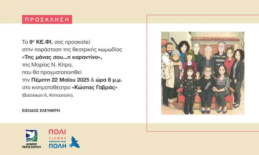 Μια ξεκαρδιστική θεατρική κωμωδία παρουσιάζει το 9ο Κέντρο Φιλίας (ΚΕ.ΦΙ.) του Δήμου Περιστερίου, την Πέμπτη 22 Μαΐου 2025 και ώρα 20:00, στο κινηματοθέατρο «Κώστας Γαβράς» (Βασιλικών 6, Κηπούπολη). Η είσοδος είναι ελεύθερη, με σειρά προσέλευσης.
