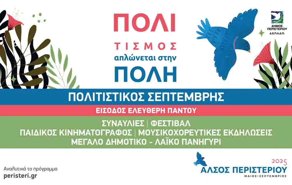 Ο Δήμος Περιστερίου, πιστός στο ραντεβού του με τον πολιτισμό, παρουσιάζει ένα πλούσιο και πολύπλευρο πρόγραμμα εκδηλώσεων για τον Σεπτέμβριο του 2025, κλείνοντας έναν μεγάλο κύκλο πολιτιστικών δράσεων που ξεκίνησε τον Μάιο. Όλες οι εκδηλώσεις θα πραγματοποιηθούν στο Άλσος Περιστερίου, το ωραιότερο Άλσος της Αττικής, με είσοδο ελεύθερη για όλους τους πολίτες.
