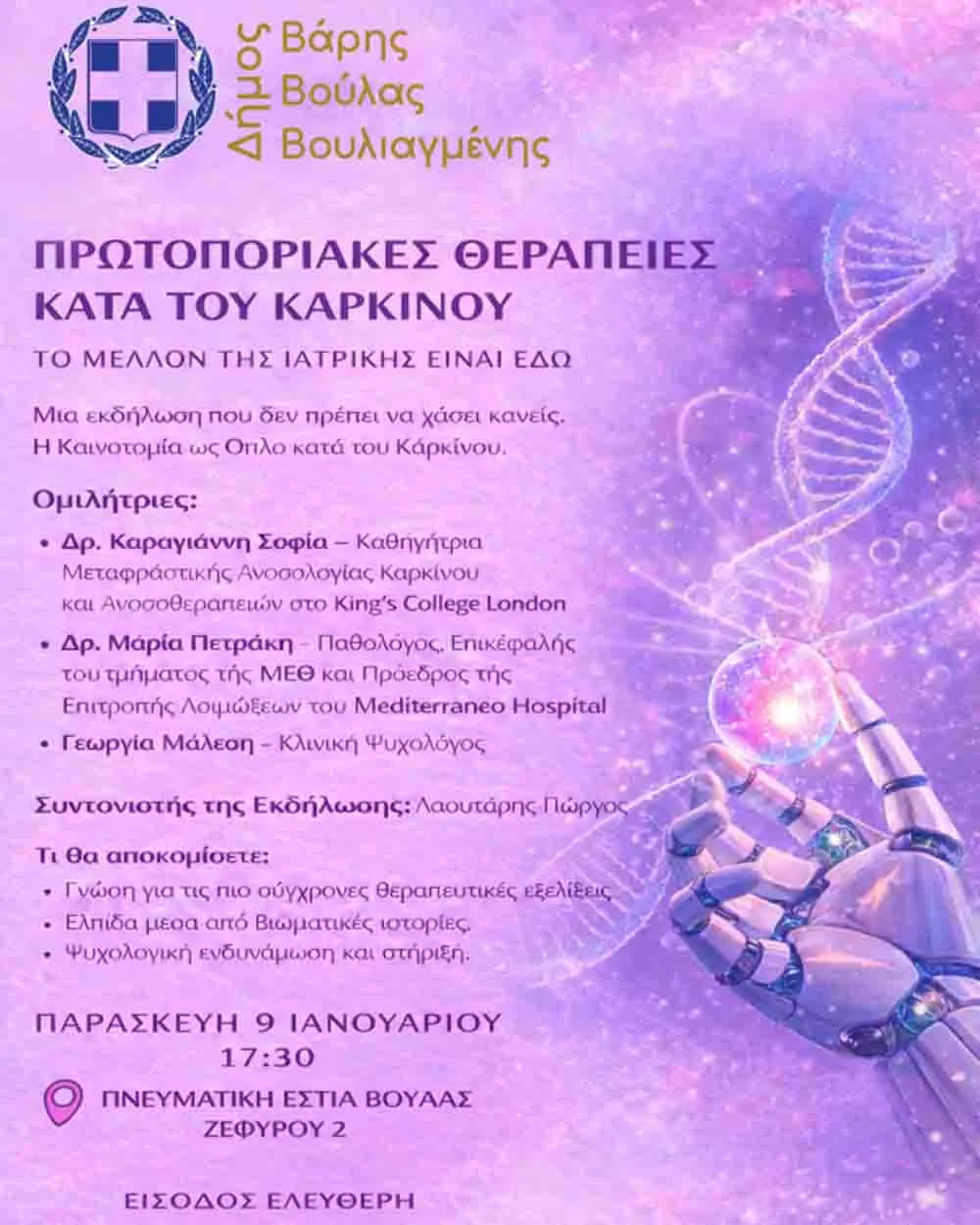 Ο Δήμος Βάρης Βούλας Βουλιαγμένης διοργανώνει μια ιδιαίτερα σημαντική ενημερωτική εκδήλωση με θέμα τις πρωτοποριακές θεραπείες κατά του καρκίνου, αναδεικνύοντας τον καθοριστικό ρόλο της καινοτομίας στη σύγχρονη ιατρική και στη μάχη για τη ζωή.