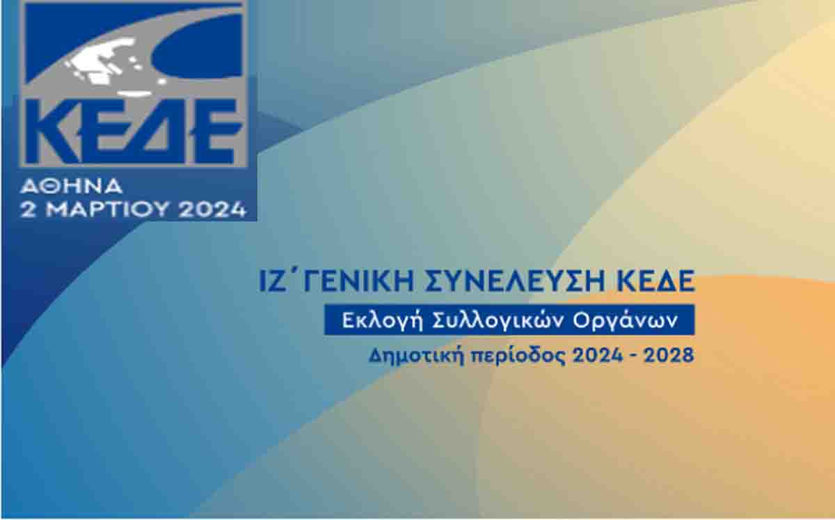 Το Σάββατο, 2 Μαρτίου 2024, συγκαλείται η ΙΖ΄ Γενική Συνέλευση της Κεντρικής Ένωσης Δήμων Ελλάδας (ΚΕΔΕ) για την ανάδειξη του νέου Διοικητικού Συμβουλίου, καθώς και του νέου Εποπτικού Συμβουλίου της νέα δημοτικής περιόδου 2024-2028.