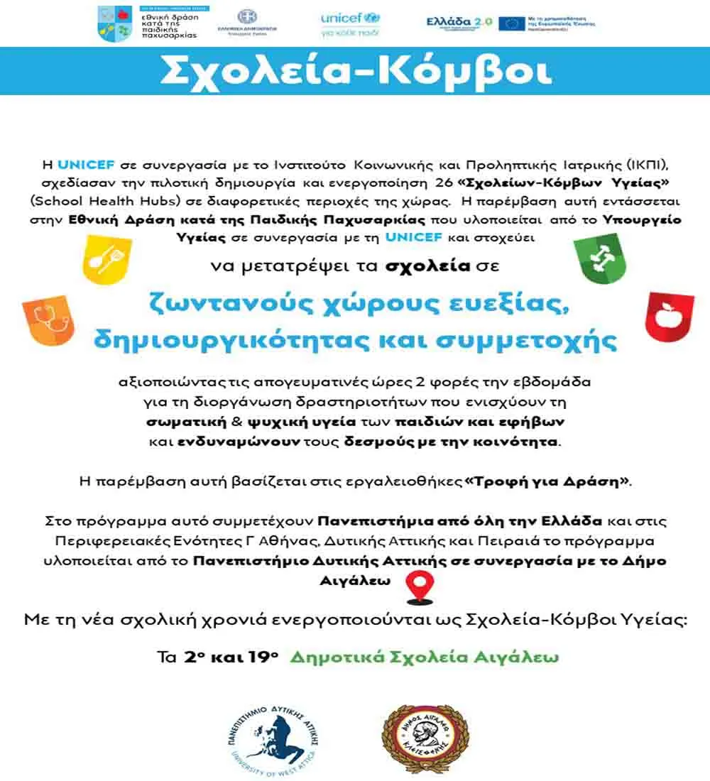 Ο Δήμος Αιγάλεω, με σταθερή προσήλωση στη στήριξη της σχολικής κοινότητας και της νέας γενιάς, συμμετέχει στην πανελλαδική πρωτοβουλία της UNICEF και του Ινστιτούτου Κοινωνικής και Προληπτικής Ιατρικής (ΙΚΠΙ) για τη δημιουργία και λειτουργία «Σχολείων-Κόμβων Υγείας» (School Health Hubs).