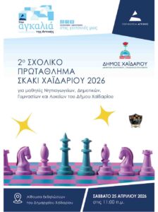 Το Σάββατο 25 Απριλίου, ο Δήμος Χαϊδαρίου σε συνεργασία με την Περιφέρεια Αττικής διοργανώνουν το 2ο Σχολικό Πρωτάθλημα Σκάκι, μια πρωτοβουλία που φιλοδοξεί να εδραιωθεί ως θεσμός για τη μαθητική κοινότητα της περιοχής. Η διοργάνωση θα πραγματοποιηθεί στην αίθουσα εκδηλώσεων του Δημαρχείου, συγκεντρώνοντας μαθητές από το νηπιαγωγείο έως και το λύκειο.
