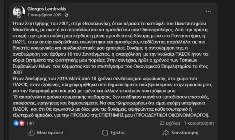 Ο Γιώργος Λαμπράκης διαγράφεται δεύτερη φορά – για διαφορετικούς βέβαια λόγους από το ΠΑΣΟΚ. Η πρώτη ήταν το Δεκέμβριο του 2019, με απόφαση της αείμνηστης Φώφης Γεννηματά καθώς μαζί με άλλα τέσσερα στελέχη αρνήθηκαν να κατέβουν με την αυτόνομη «πράσινη» παράταξη στις εκλογές του Οικονομικού Επιμελητηρίου και αποφάσισαν να κατέβουν υποψήφιοι με την παράταξη του ΣΥΡΙΖΑ.