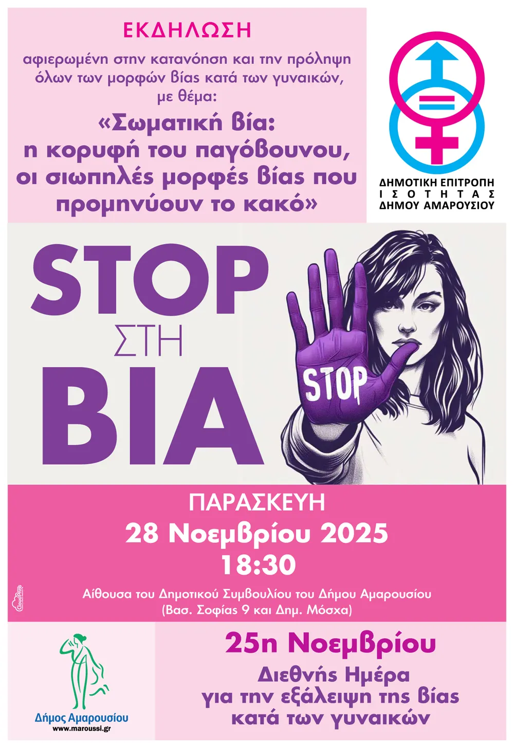 Ο Δήμαρχος Αμαρουσίου Θεόδωρος Αμπατζόγλου, η Πρόεδρος Ελένη Λέκκα και τα μέλη της Δημοτικής Επιτροπής Ισότητας του Δήμου Αμαρουσίου (Δ.ΕΠ.ΙΣ.), με αφορμή την 25η Νοεμβρίου – Διεθνή Ημέρα για την εξάλειψη της βίας κατά των γυναικών, σας προσκαλούν στην εκδήλωση με θέμα: «Σωματική βία: η κορυφή του παγόβουνου, οι σιωπηλές μορφές βίας που προμηνύουν το κακό» την Παρασκευή 28 Νοεμβρίου 2025 και ώρα 18:30, στην Αίθουσα του Δημοτικού Συμβουλίου του Δήμου Αμαρουσίου (Βασ. Σοφίας 9 και Δημ. Μόσχα)