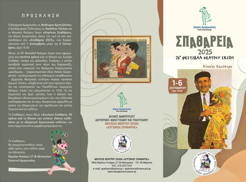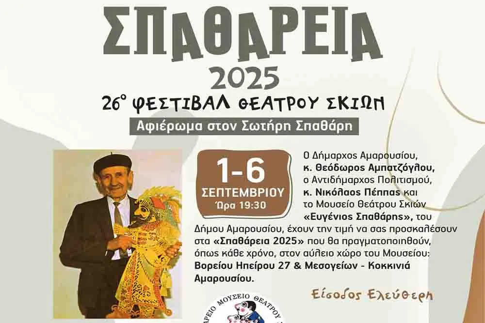 Ο Δήμαρχος Αμαρουσίου, Θεόδωρος Αμπατζόγλου, ο Αντιδήμαρχος Πολιτισμού, Νικόλαος Πέππας και το Μουσείο Θεάτρου Σκιών «Ευγένιος Σπαθάρης», του Δήμου Αμαρουσίου, έχουν την τιμή να σας προσκαλέσουν στα «Σπαθάρεια 2025», που διοργανώνονται από 1 Σεπτεμβρίου μέχρι και 6 Σεπτεμβρίου, ώρα 19:30.