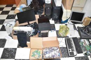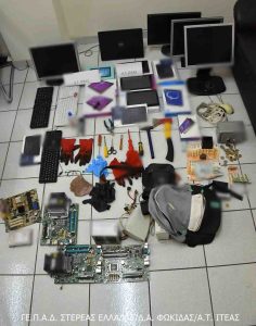 Ειδικότερα, μεταξύ άλλων, κατασχέθηκαν κεντρικές μονάδες Η/Υ, φορητοί Η/Υ (laptop), tablet, οθόνες Η/Υ, πλήθος περιφερειακών συσκευών – εξοπλισμού Η/Υ (ηχεία, «ποντίκια», πληκτρολόγια, ζεύγη ακουστικών, πλακέτες, τροφοδοτικά, κάμερες, εξωτερικοί σκληροί δίσκοι κ.λπ.), φορτιστές Η/Υ διαφόρων τύπων, πληθώρα καλωδίων διαφόρων τύπων και το χρηματικό ποσό των 610 ευρώ.