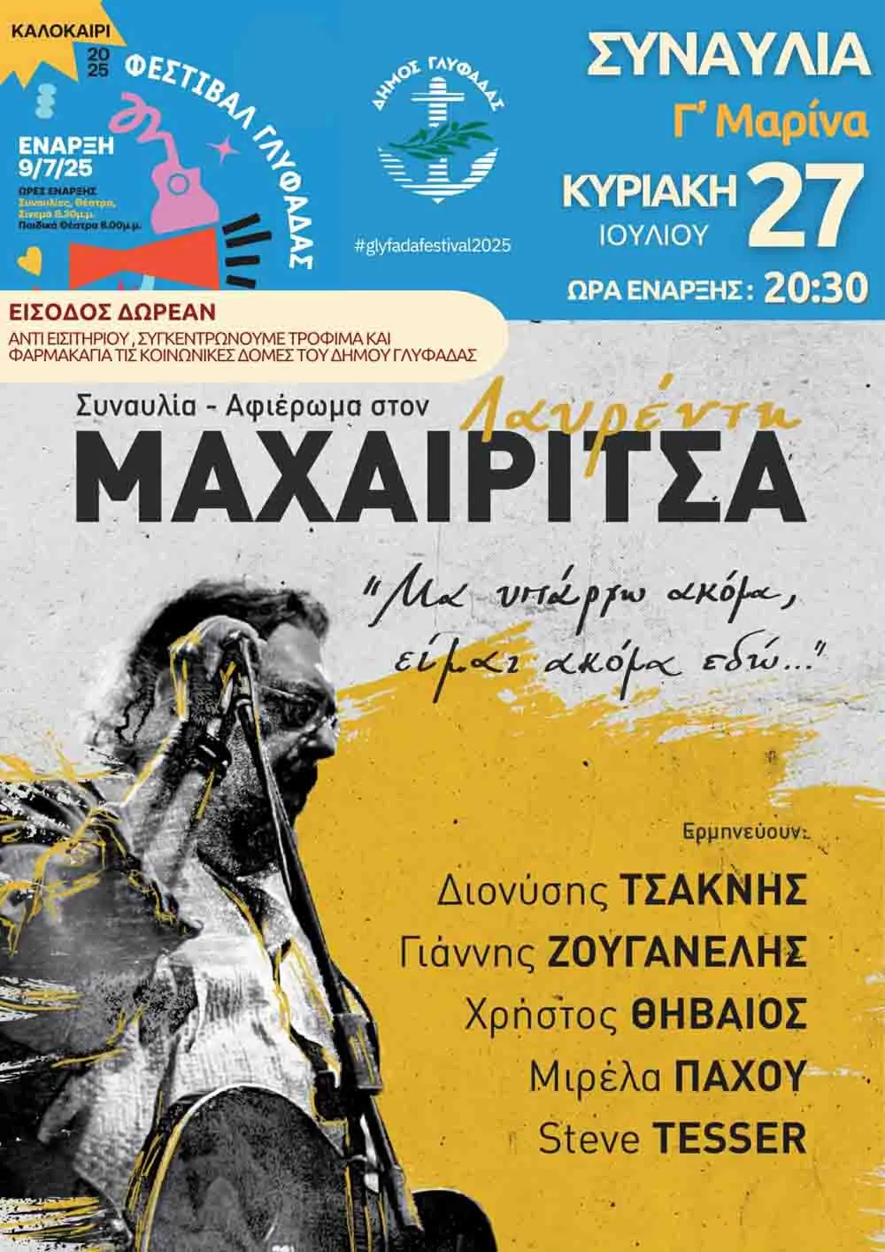 Μετά την τεράστια επιτυχία της περσινής sold out συναυλίας στο Θέατρο Λυκαβηττού και τη φετινή στο Βεάκειο Θέατρο Πειραιά, έρχεται τον Ιούλιο στη Γ’ Μαρίνα Γλυφάδας, την Κυριακή 27 Ιουλίου, με τους Διονύση Τσακνή, Γιάννη Ζουγανέλη, Χρήστο Θηβαίο, Μιρέλα Πάχου και Steve Tesser, αγαπημένους ερμηνευτές και συνοδοιπόρους του Λαυρέντη, για να τιμήσουμε όλοι μαζί τον αγαπημένο μας Λαυρέντη Μαχαιρίτσα, τον ερμηνευτή των επιτυχιών, της ευαισθησίας και της ανθρωπιάς, που σφράγισε μελωδικά και υπέροχα τα ακούσματά μας.
