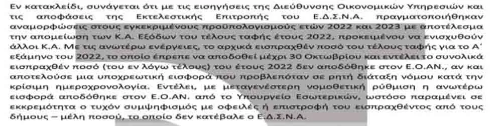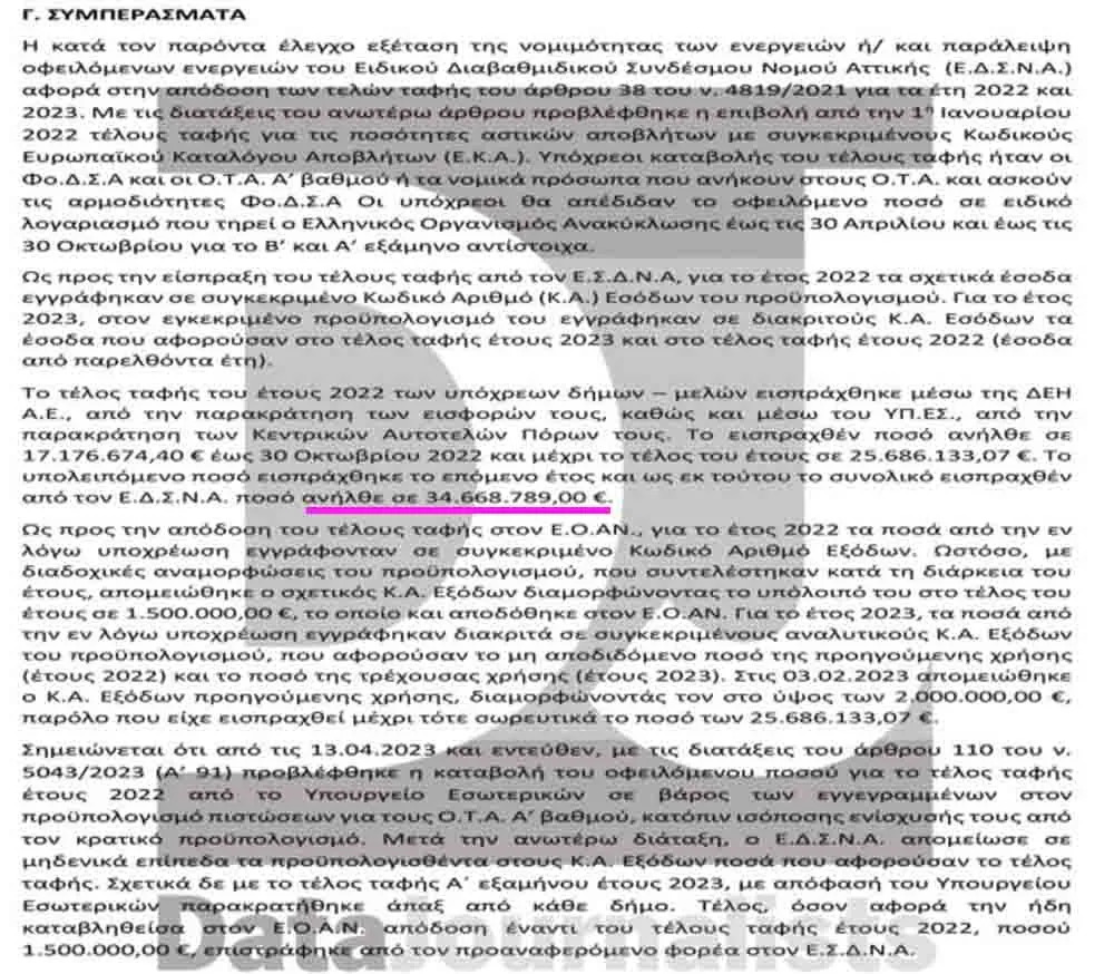 Το δημοσίευμα της ιστοσελίδας Data Journalists για τη διαχείριση του ΕΣΔΝΑ τα έτη 2020 – 2022 αναφέρουν μια μαύρη τρύπα ύψους 34,668,789,000 ευρώ αποτέλεσμα που στέλνουν στον εισαγγελέα εκείνους που την επίμαχη περίοδο συμμετείχαν και ψήφιζαν τις αποφάσεις του Διοικητικού Συμβουλίου, οι οποίοι μέσα από μια δαιδαλώδη διαδικασία κατάφεραν να μην αποδώσουν ποτέ το ποσό των 34 εκατομμύριων ευρώ στον Ελληνικό Οργανισμό Ανακύκλωσης.