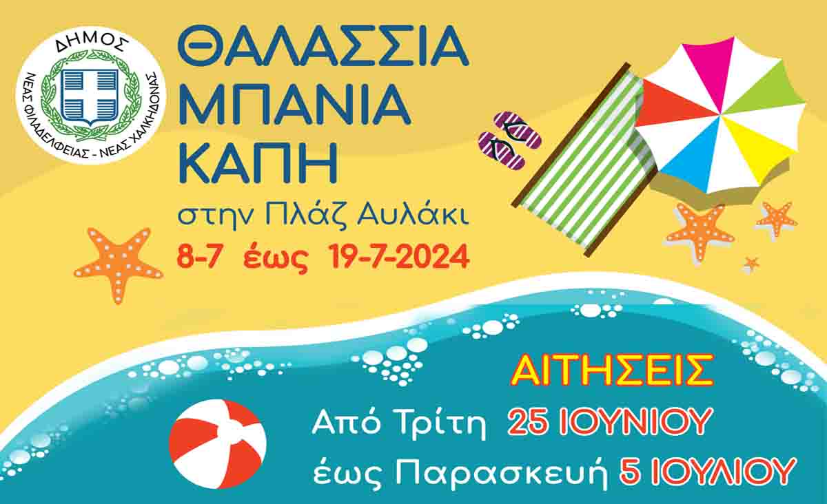 Ξεκίνησε η περίοδος αιτήσεων για τα θαλάσσια μπάνια του Δήμου Νέας Φιλαδέλφειας – Νέας Χαλκηδόνας, που θα πραγματοποιηθούν από 8 έως 19 Ιουλίου 2024.