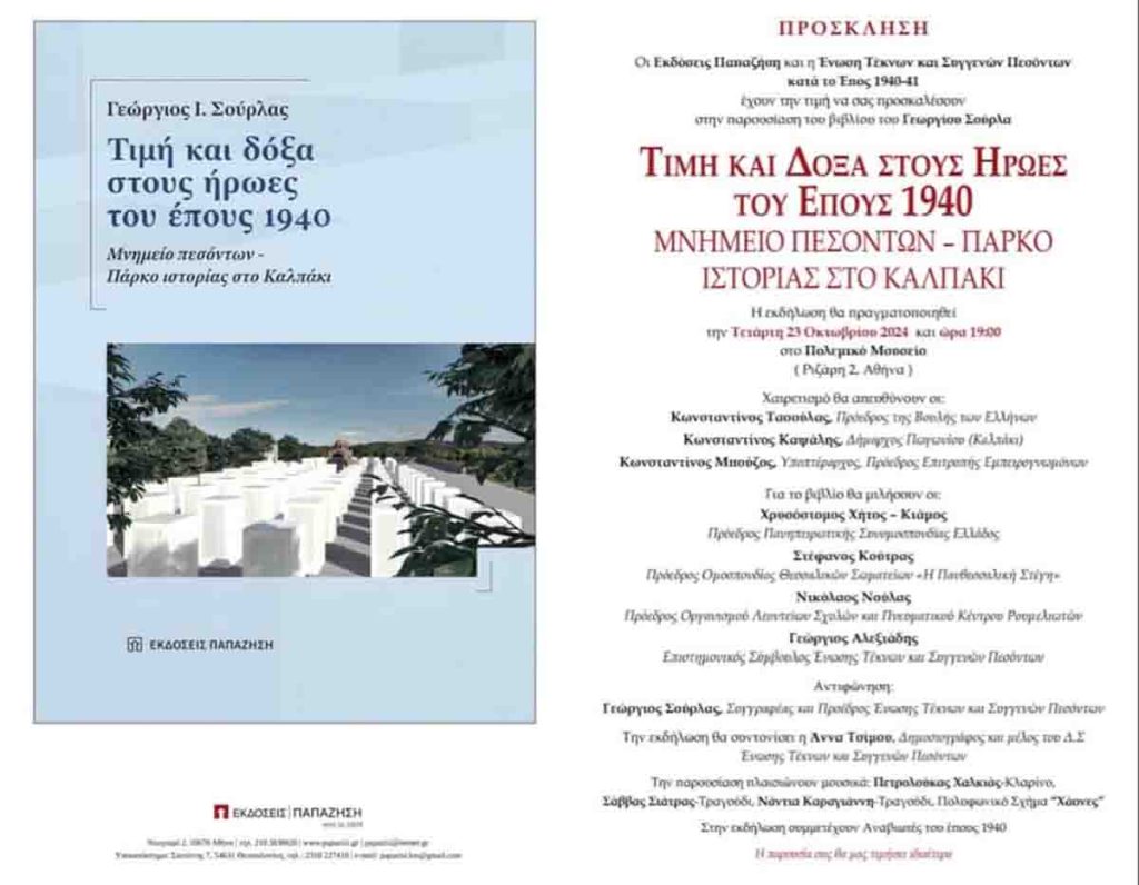 Η Ένωση Τέκνων και Συγγενών Πεσόντων κατά το Έπος 1940-41 και οι Εκδόσεις Παπαζήση, παρουσιάζουν το βιβλίο «Τιμή και Δόξα στους Ήρωες του Έπους 1940 – Μνημείο Πεσόντων – Πάρκο Ιστορίας στο Καλπάκι» του συγγραφέα Γιώργου Σούρλα,μ σε εκδήλωση που θα πραγματοποιηθεί στο Πολεμικό Μουσείο, -Ριζάρη 2 Αθήνα) τη Τετάρτη 23 Οκτωβρίου / 19:00…
