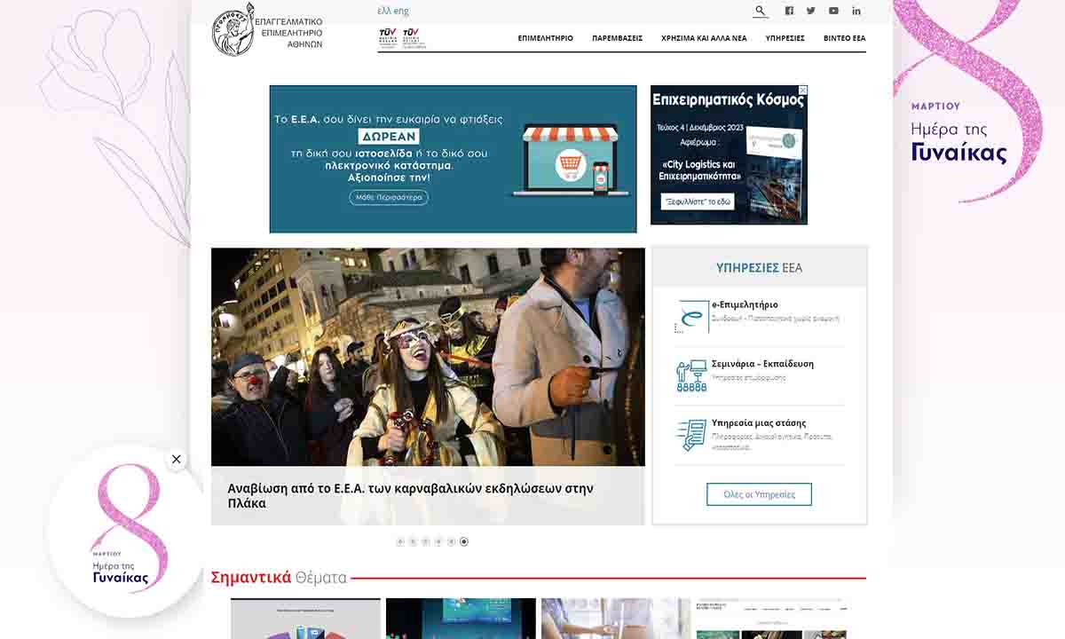 Στις 8 Μαρτίου και για 24 ώρες η εικόνα του site eea.gr αλλάζει χρωματισμό ενώ το απόγευμα της Παρασκευής το κτίριο που στεγάζεται το Ε.Ε.Α., επί της Πανεπιστημίου 44, θα φωτισθεί σε απόχρωση magenta (κόκκινο-μωβ).