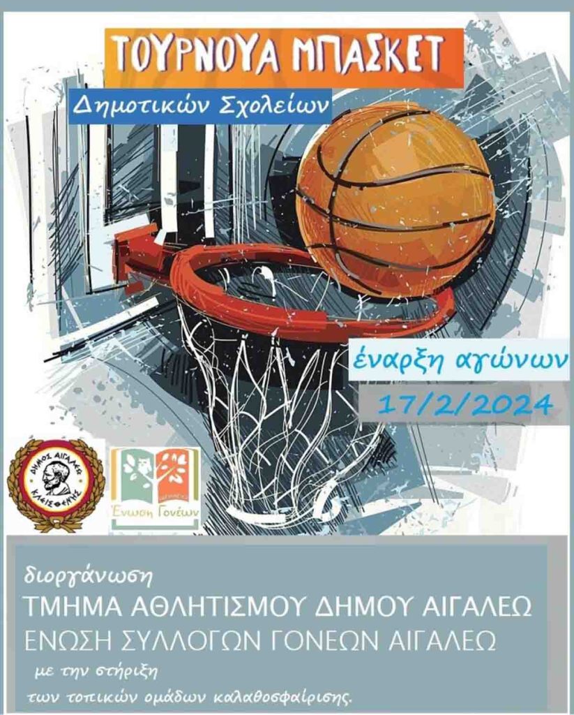Σας ενημερώνουμε ότι το Αθλητικό Τμήμα του Δήμου Αιγάλεω και η Ένωση Συλλόγων Γονέων Αιγάλεω συνδιοργανώνουν τουρνουά μπάσκετ Δημοτικών σχολείων, με συμμετοχή μαθητών Ε΄ και ΣΤ΄ τάξης.