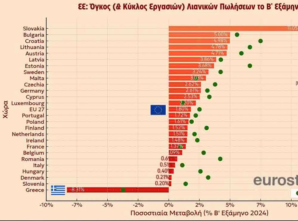 Το γεγονός αυτό φαίνεται από την αύξηση των σφραγισμένων (=διαμαρτυρημένων) επιταγών κατά 45% το 2024 στα 101,8 εκ. € (οι απλήρωτες συναλλαγματικές κατά 3,84% στα 13,2 εκ. €), σε μία εποχή που το λιανικό εμπόριο υποφέρει – έχοντας μειωθεί σε όγκο κατά 8,3% το 2ο εξάμηνο του 2024. Ευρίσκεται δηλαδή πάνω από 10% χαμηλότερα από το μέσον όρο της ΕΕ – ο οποίος ήταν στο +2,5%.