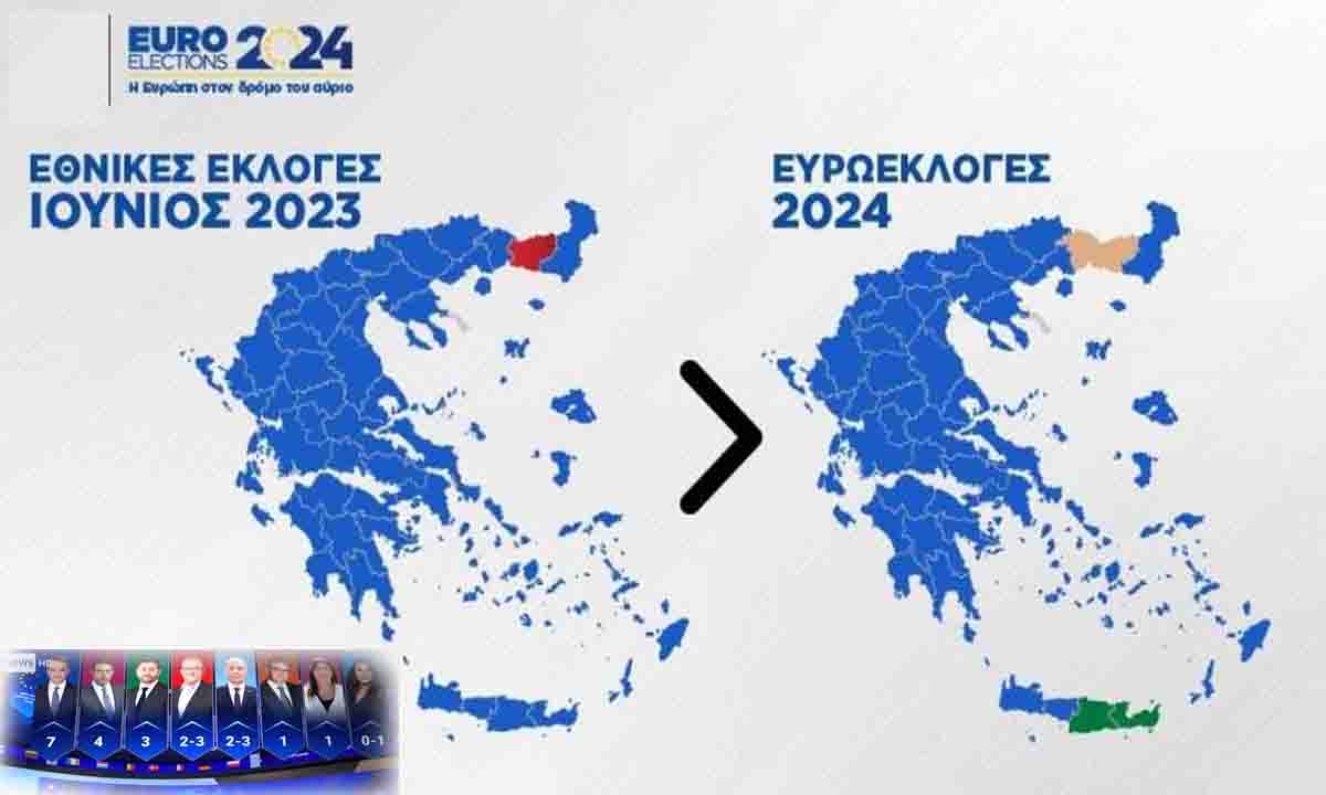 Πρωτιά της Νέας Δημοκρατίας (Ν.Δ.) με διαφορά 13 μονάδων έναντι του ΣΥΡΙΖΑ, αλλά με εκατέρωθεν απώλειες σχεδόν κατά 5,5% και 9% αντίστοιχα (από τις ευρωεκλογές του 2019) και άνοδο των κομμάτων που κινούνται στην ακροδεξιάς, καθώς και της αποχής που αγγίζει το 60% κατέγραψαν τα αποτελέσματα εκλογών, για το Ευρωκοινοβούλιο, στην Ελλάδα.