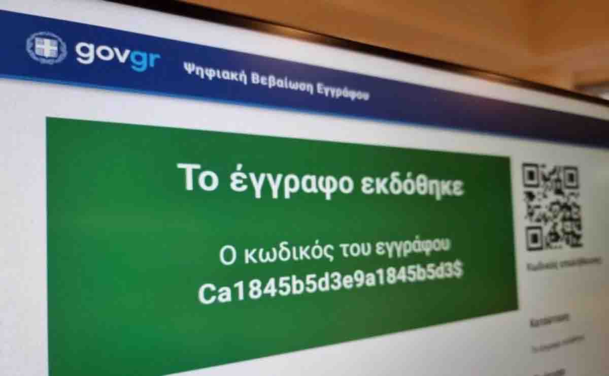 - Μοναδικό αναγνωριστικό αριθμό επαλήθευσης, με σκοπό την επαλήθευση του περιεχομένου του εγγράφου από τον λήπτη. Η επαλήθευση γίνεται μέσω της Ενιαίας Ψηφιακής Πύλης της Δημόσιας Διοίκησης (gov.gr – ΕΨΠ), σύμφωνα με την παρ. 4 του άρθρου 27 του ν. 4727/2020.