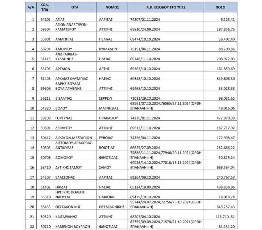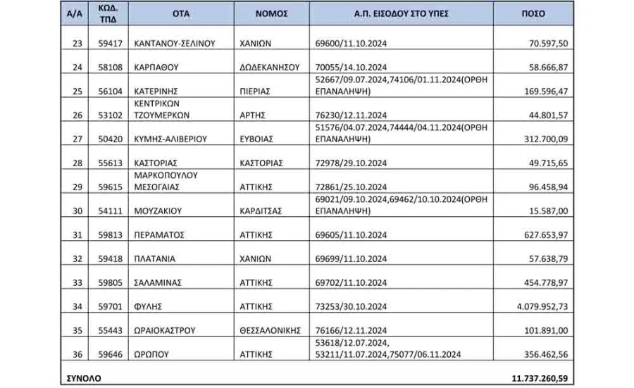 Εγκρίθηκε από το υπουργείο Εσωτερικών επιχορήγηση συνολικού ποσού έως 11.737.260,59€ σε 36 δήμους της χώρας για την εξόφληση απλήρωτων υποχρεώσεών τους που απορρέουν από διαταγές πληρωμής και δικαστικές αποφάσεις που έχουν καταστεί τελεσίδικες έως την 24η Σεπτεμβρίου 2024 και αφορούν σε αξιώσεις από προμήθειες αγαθών ή παροχή υπηρεσιών ή εκτέλεση έργων καθώς και αποζημιώσεις από αδικοπραξία.