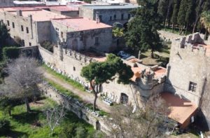 Το κτηριακό συγκρότημα έχει σύνθετη οικοδομική ιστορία, ενώ η σημερινή εικόνα του οφείλεται σε μεγάλο βαθμό σε εργασίες ανακατασκευής κατά την περίοδο της Ιταλοκρατίας. Το βόρειο κτήριο, με επιφάνεια 320 τ.μ., εφάπτεται στην υποδομή της βόρειας οχύρωσης. Το ισόγειο αποτελείται από δυο θολωτές αίθουσες, η νότια με ενδιάμεσους πεσσούς, ενώ ο όροφός του από μια αίθουσα ύψους 7,20 μ., που χωρίζεται με κεντρική τοξοστοιχία σε δυο κλίτη και επιστέφεται από ξύλινη επίπεδη οροφή. Εντός του πάχους της τοιχοποιίας του ανατολικού τοίχου αναπτύσσεται κλίμακα που οδηγεί στο δώμα. Το δε νότιο κτήριο, με επιφάνεια 255 τ.μ., αποτελείται από τέσσερις χώρους που συνδέονται με εσωτερικά ανοίγματα.